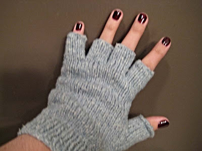 Modifications: I made all the fingers to length except the right index finger. Also, Instead of doing two decrease rows at the end of the fingers and then pulling the yarn through the last six stitches to bind off, I did one decrease round then used kitchener stitch to bind off. I just thinks this looks nicer.